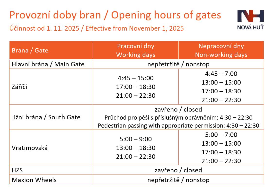 | Recepce ředitelství | Pracovní dny 7:00 – 15:00 | 725 664 500 | RecepceReditelstvi.Ostrava@novahut.cz |